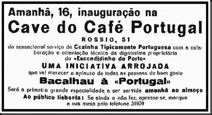 O “Café Portugal” foi inaugurado na Praça D. Pedro IV (Rossio) nos 56-58, em Lisboa no dia 16 de Abril de 1938. Foi projectado pelo arquitecto Cristino da Silva. Os seus proprietários eram Jorge Soriano, Saúl Saragga e António Maria Cardoso também sócio dos «Cafés Reunidos». Neste local tinha existido anteriormente, no século XIX uma loja de pianos “J. Heliodoro de Oliveira” oriunda da Rua dos Fanqueiros.