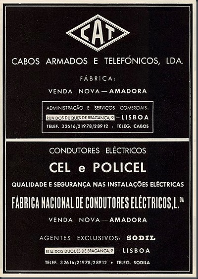 A “CAT - Cabos Armados e Telefónicos, Lda.” foi uma de três empresas pertencentes aos mesmos proprietários - CAT, CEL, POLICEL - fabricantes de cabos e condutores eléctricos, com fábrica na Venda Nova-Amadora e os serviços administrativos e comerciais em Lisboa, na Rua dos Duques de Bragança.