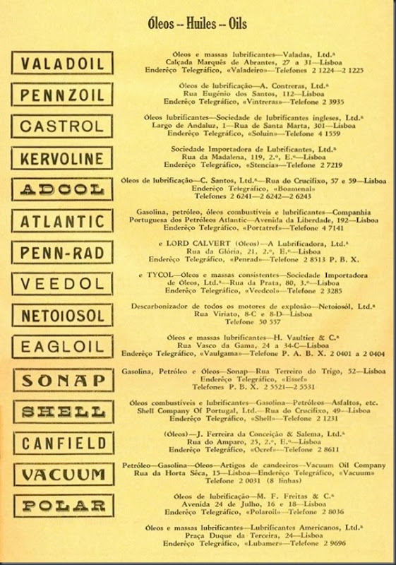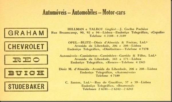 Anos mais tarde é publicado no “Boletim Cultural e Estatístico” Vol. II da Câmara Municipal de Lisboa, de 1937, a seguinte publicidade que nos dá uma ideia da oferta do mercado automóvel à época. Chamo à atenção que na publicação seguinte é exígua a referência às marcas de automóveis representadas e vendidas em Portugal, não sendo de forma representativa, em quantidade, da oferta nesse ano.