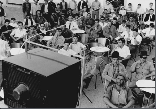Povo assistindo televisão numa esplanada