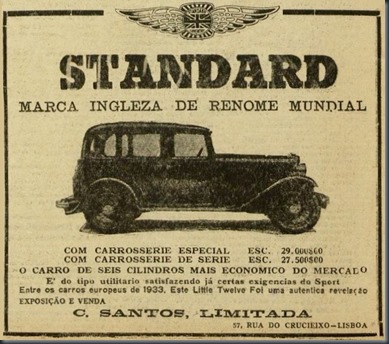 Em 1933, já nas suas novas instalações em Lisboa, na Rua do Crucifixo, inicia a comercialização de automóveis da sua nova representada britânica “Standard” pertença da “Standard Motor Company”. Anos mais tarde, junta a esta a representação da marca, também britânica, “Triumph”.