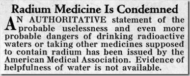 “Medicina à base de Rádio é Condenada: Um aviso, veemente, da provável inutilidade, ou ainda pior, provável perigosidade na ingestão de águas radiocativas, ou na utilização de medicamentos que contenham supostamente, Rádio, foi alertado pela American Medical Association. Evidências de propriedades medicinais da água não foram encontradas”.