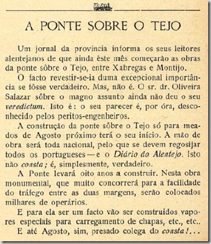 Excertos de notícias publicadas, em 1934, sobre o projecto e concurso para adjudicação construção da “Ponte sobre o Tejo” entre o Beato (Lisboa) e o Montijo, lançado pelo então Ministro das Obras Públicas, o Engº Duarte Pacheco. Os textos falam por si.