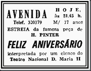 No dia 11 de Dezembro de 1967 estreava a que seria o último espectáculo a ser exibido no “Teatro Avenida”. A última peça a ser exibida foi “Feliz Aniversário”, de H. Pinter, que seria interpretada pelo elenco do “Teatro Nacional D. Maria II” pela “Companhia Rey Colaço-Robles Monteiro”.