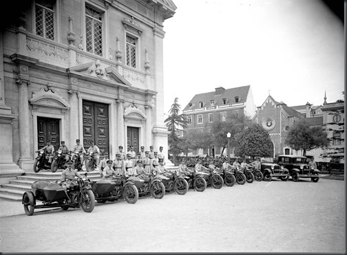 “Polícia de Segurança Pública” apresentando novas motos com “sidecar” junto à igreja dos Anjos, em Lisboa, nos anos 30 séc. XX