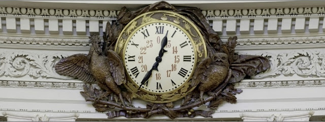 Legenda da foto anterior: «É um relógio de parede com caixa de estilo neoclássico, concebida pelo escultor Anatole Calmels, em 1866, mecanismo produzido pelo relojoeiro Reusot, em 1868, e comercializado por Jules Maury. Esta peça encontra-se no entablamento da antiga Sala da Câmara dos Dignos Pares do Reino (designada por Sala do Senado), e está posicionado de frente para a Mesa da Presidência.» in: "Parlamento.pt"