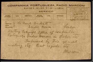 Guglielmo Marconi e esposa durante a sua visita em 1929 Telegrama enviado por Marconi para Londres desde Lisboa